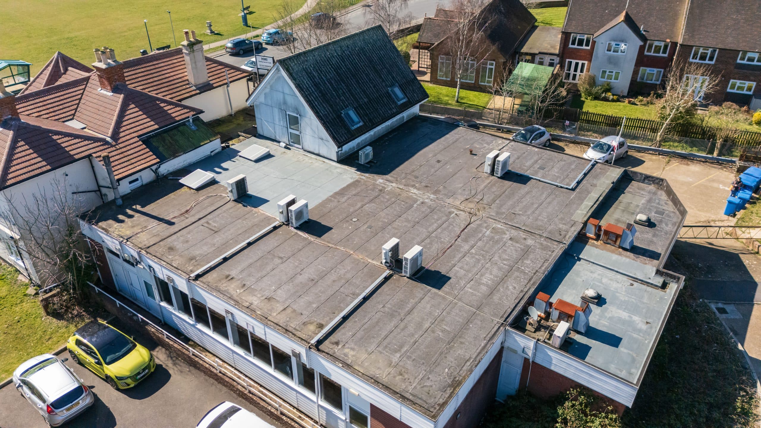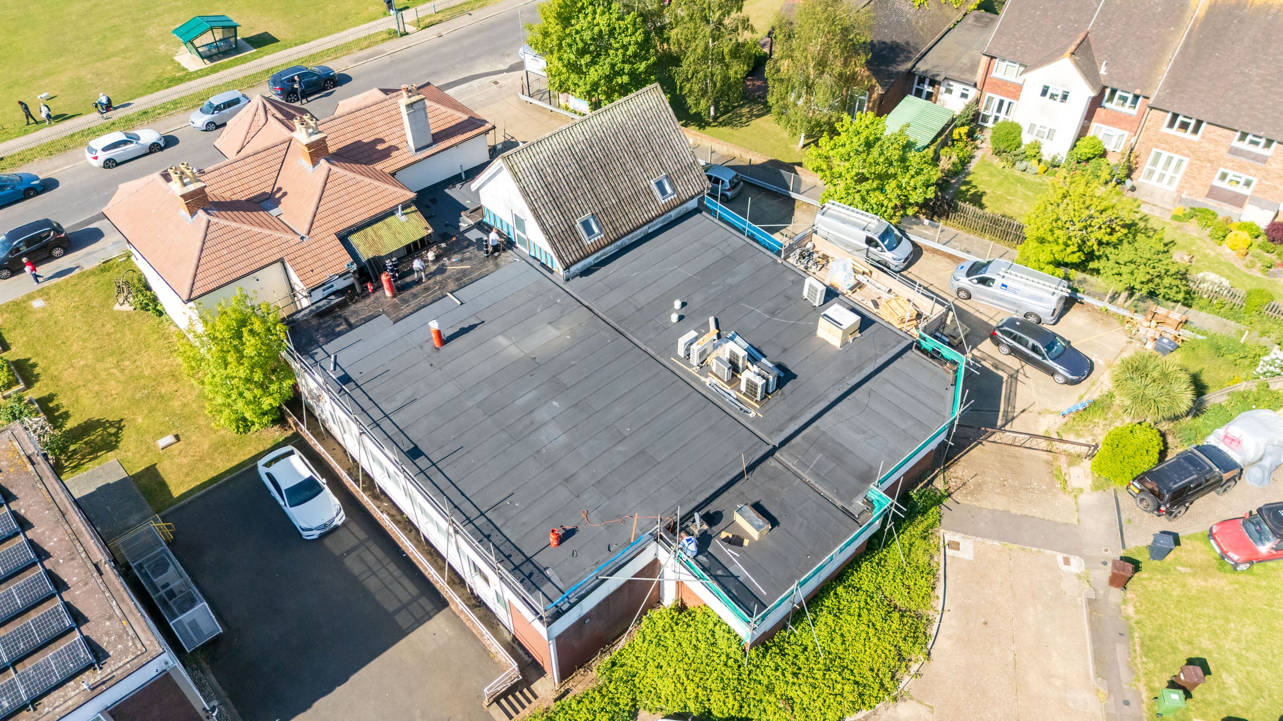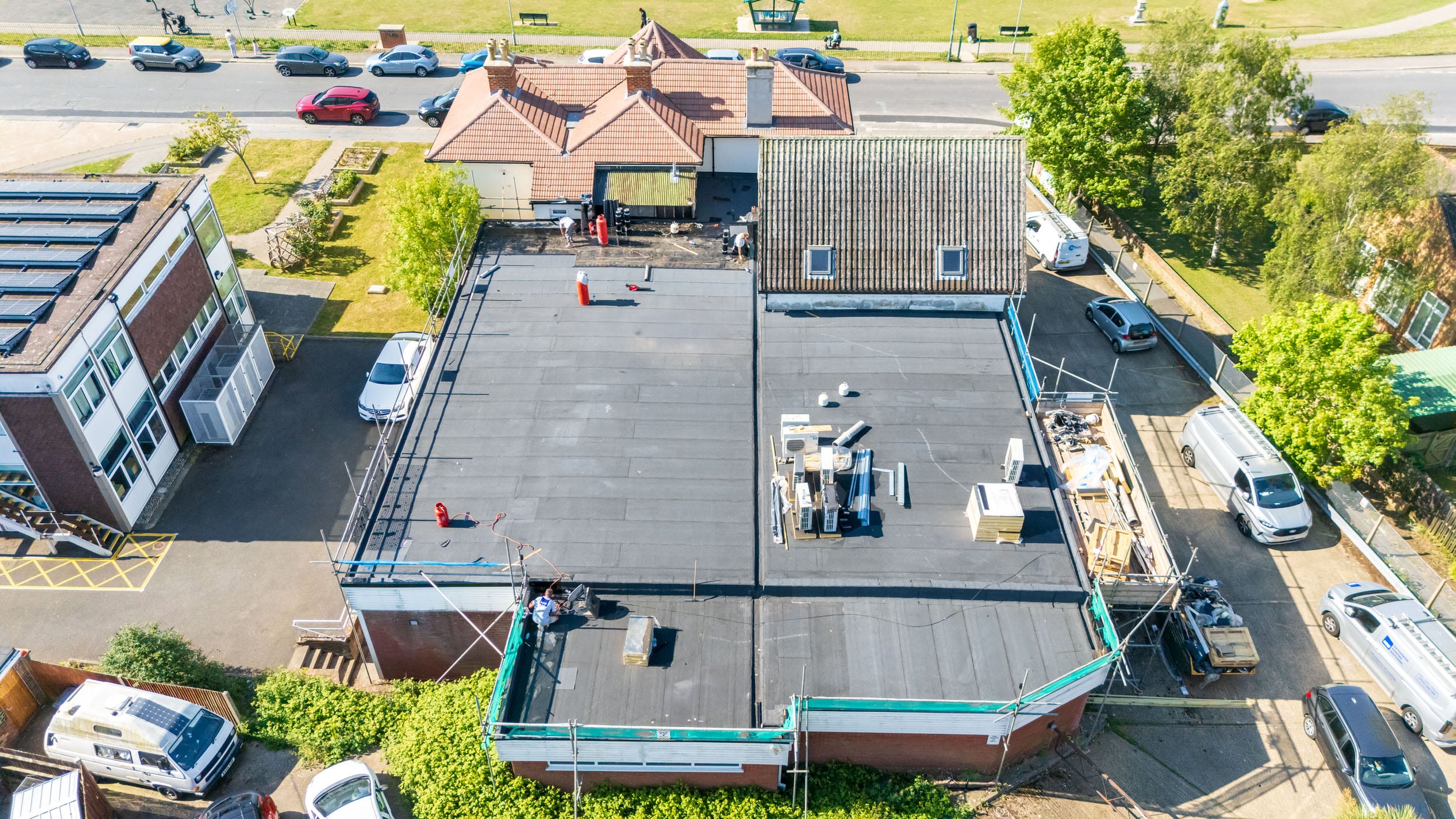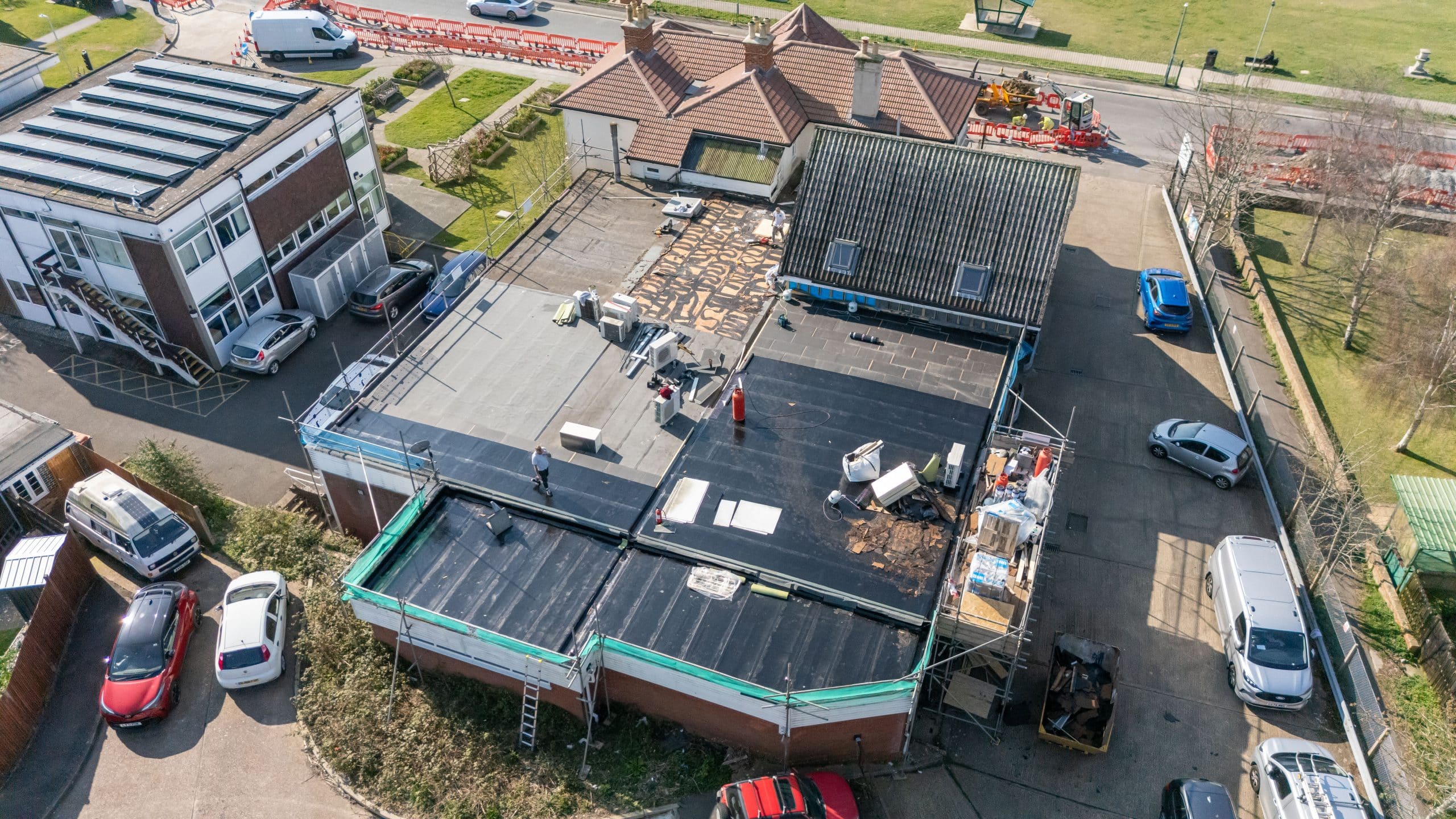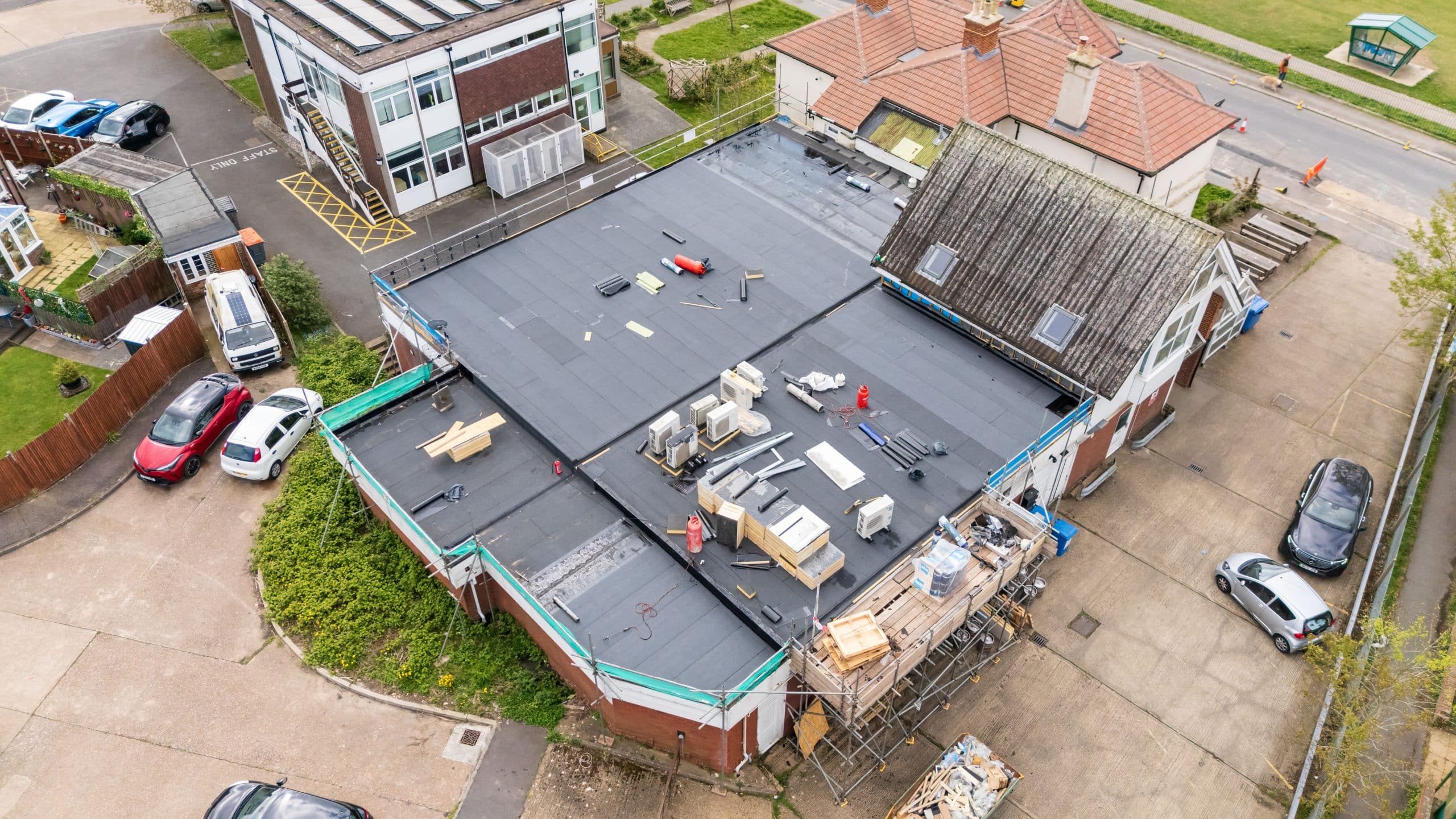 Flat roof renewal at Hailsham Memorial Institute, Western Road for Hailsham County Council, with full scaffolding, site setup, and a complete roofing system installation.