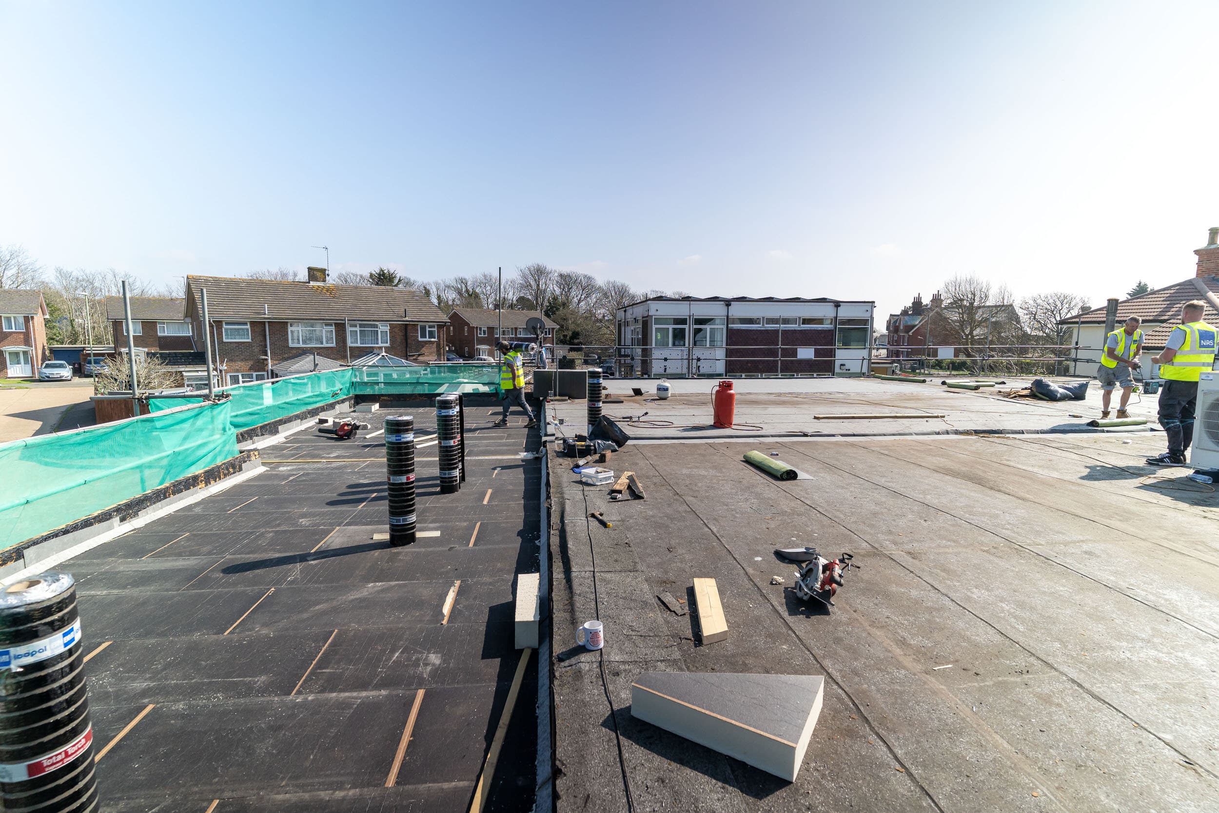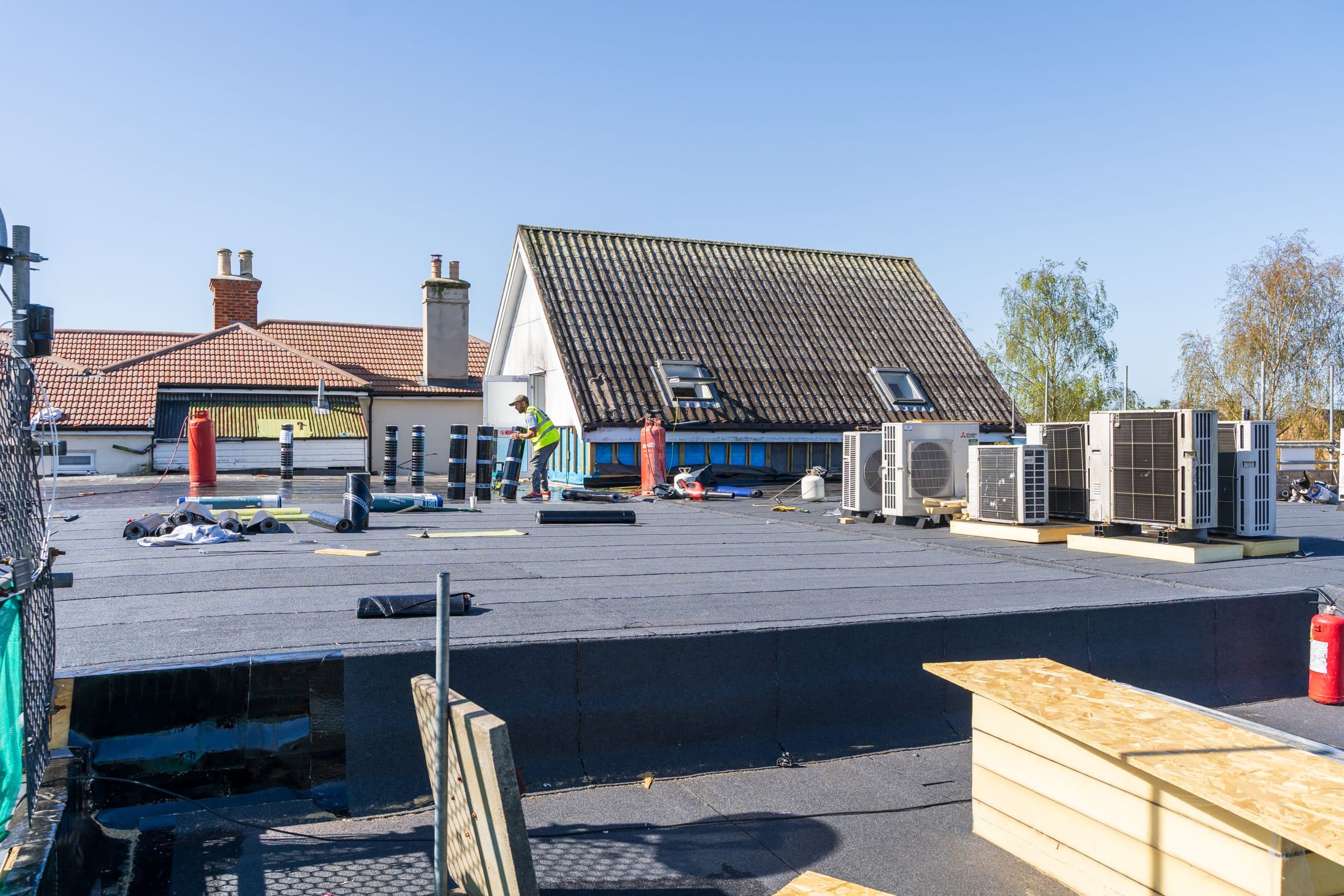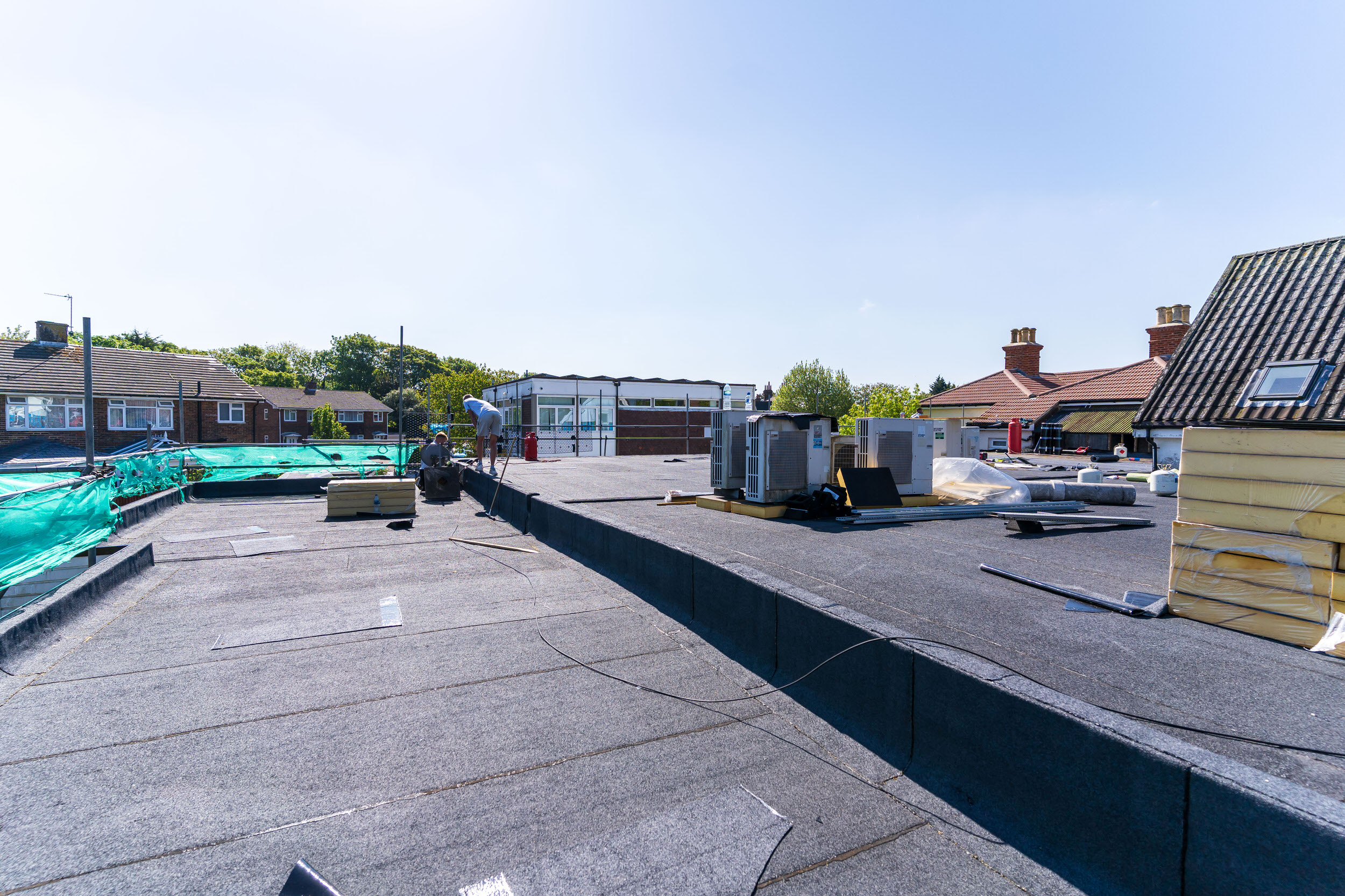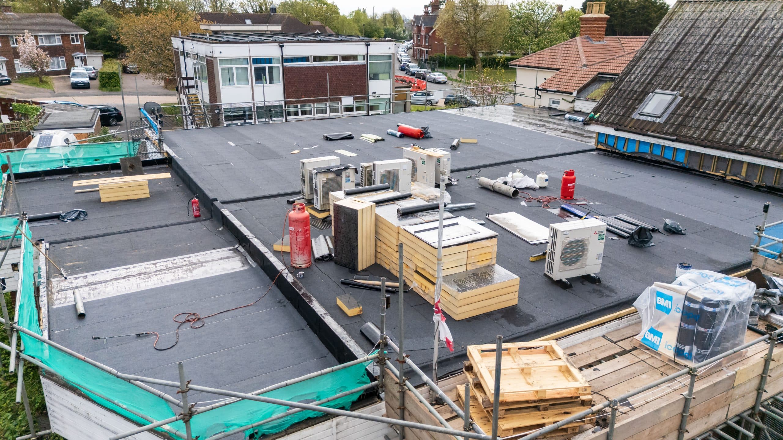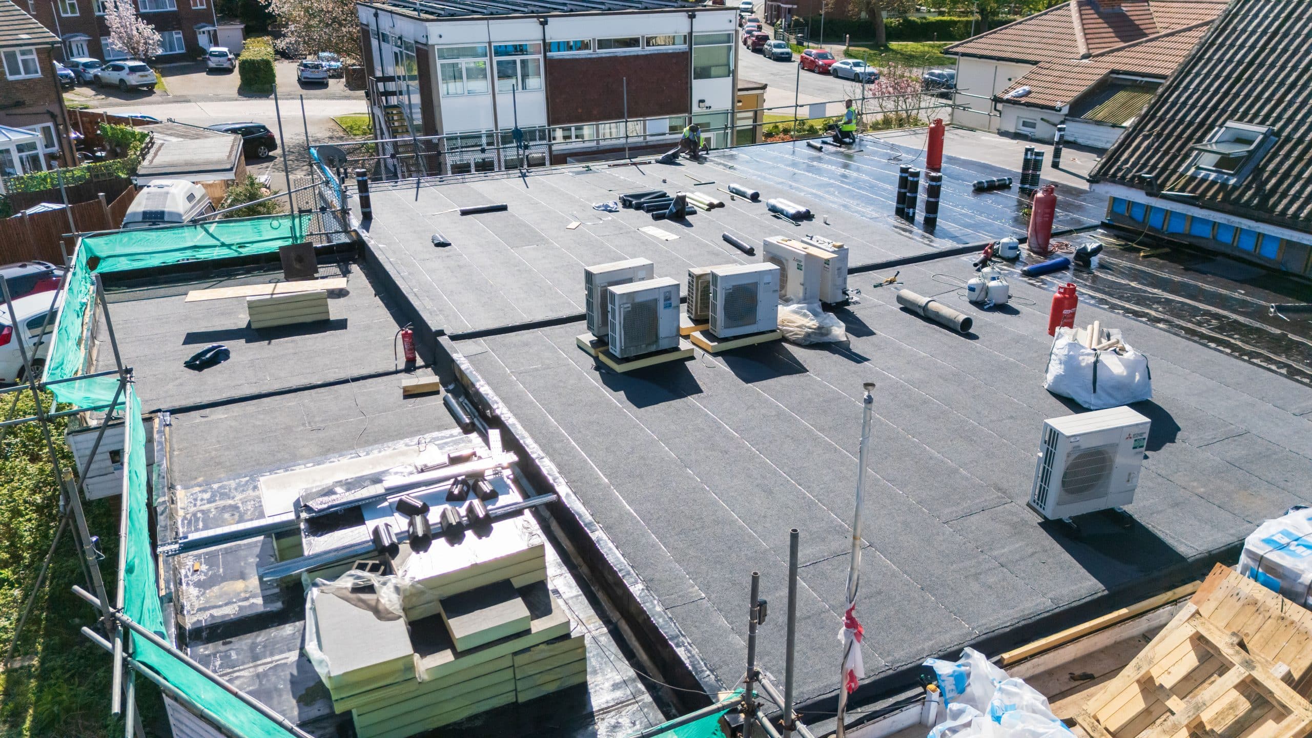 Flat roof renewal at Hailsham Memorial Institute, Western Road for Hailsham County Council, with full scaffolding, site setup, and a complete roofing system installation.