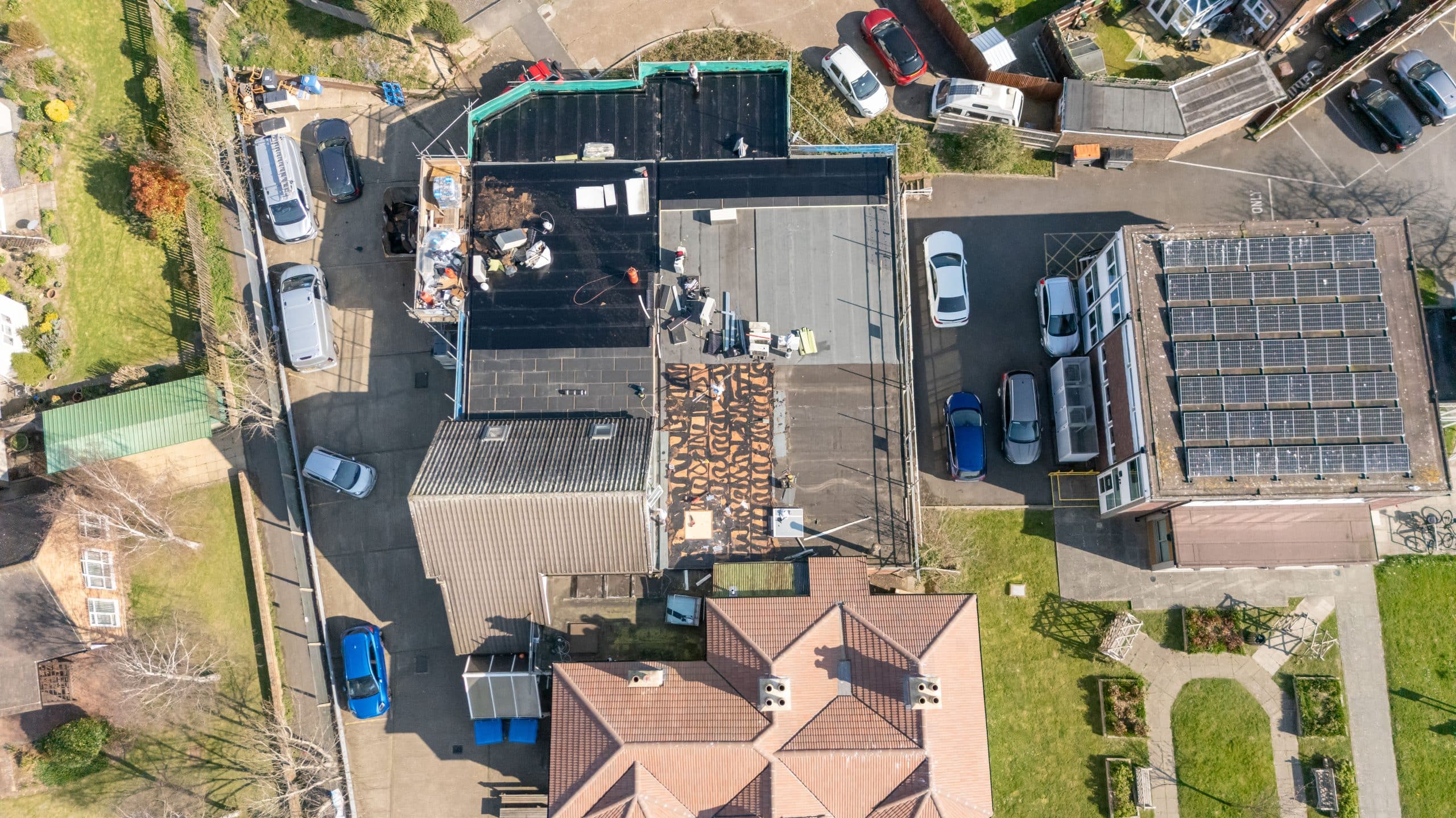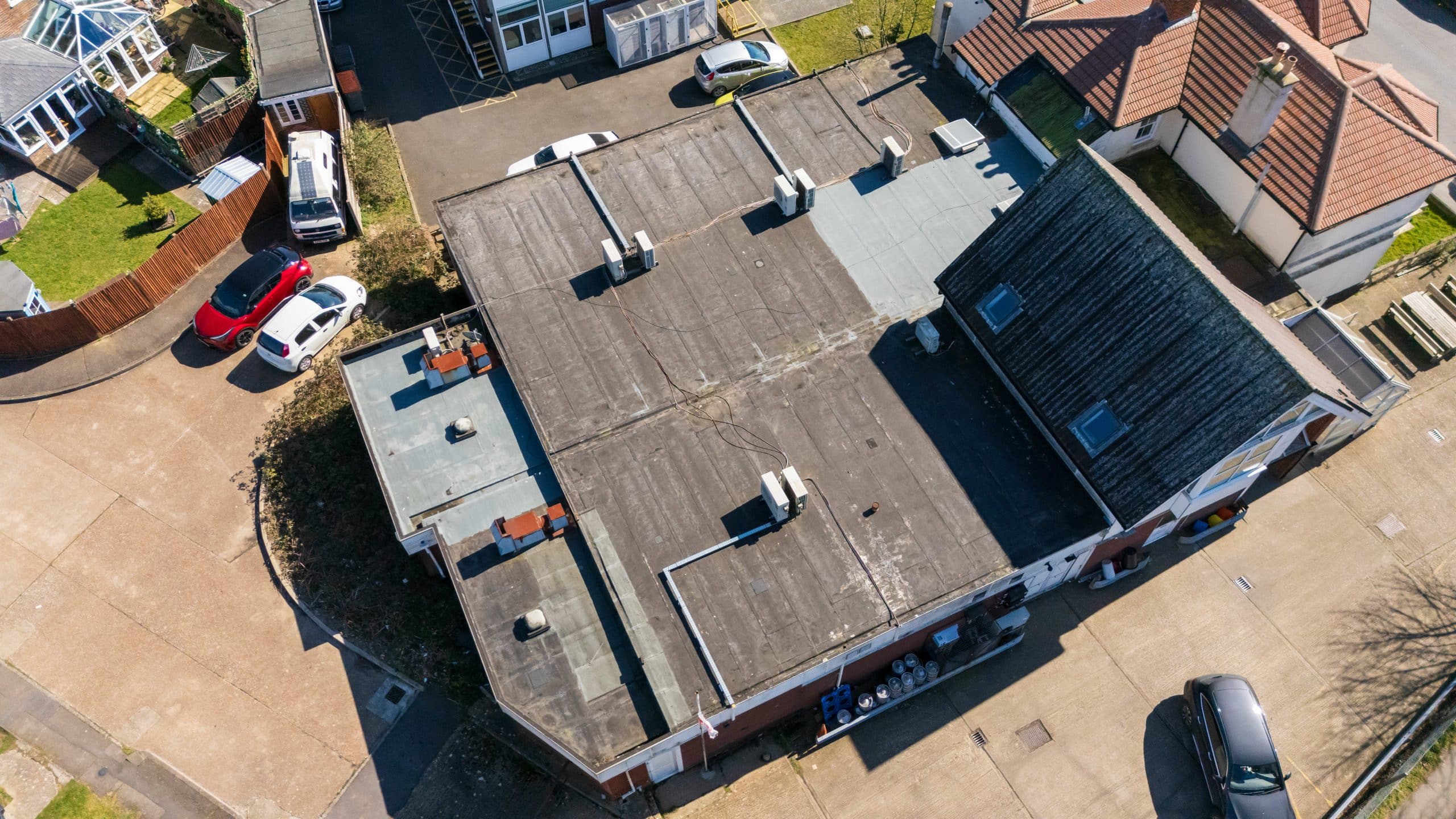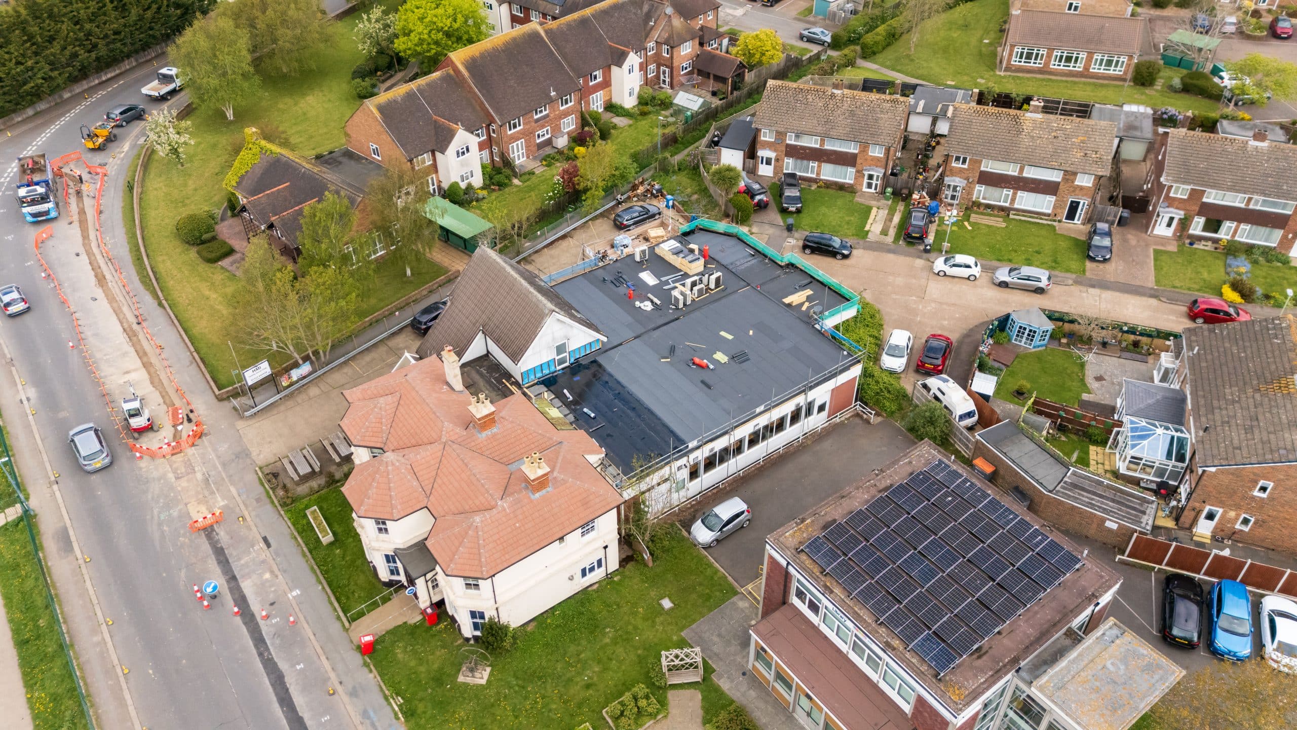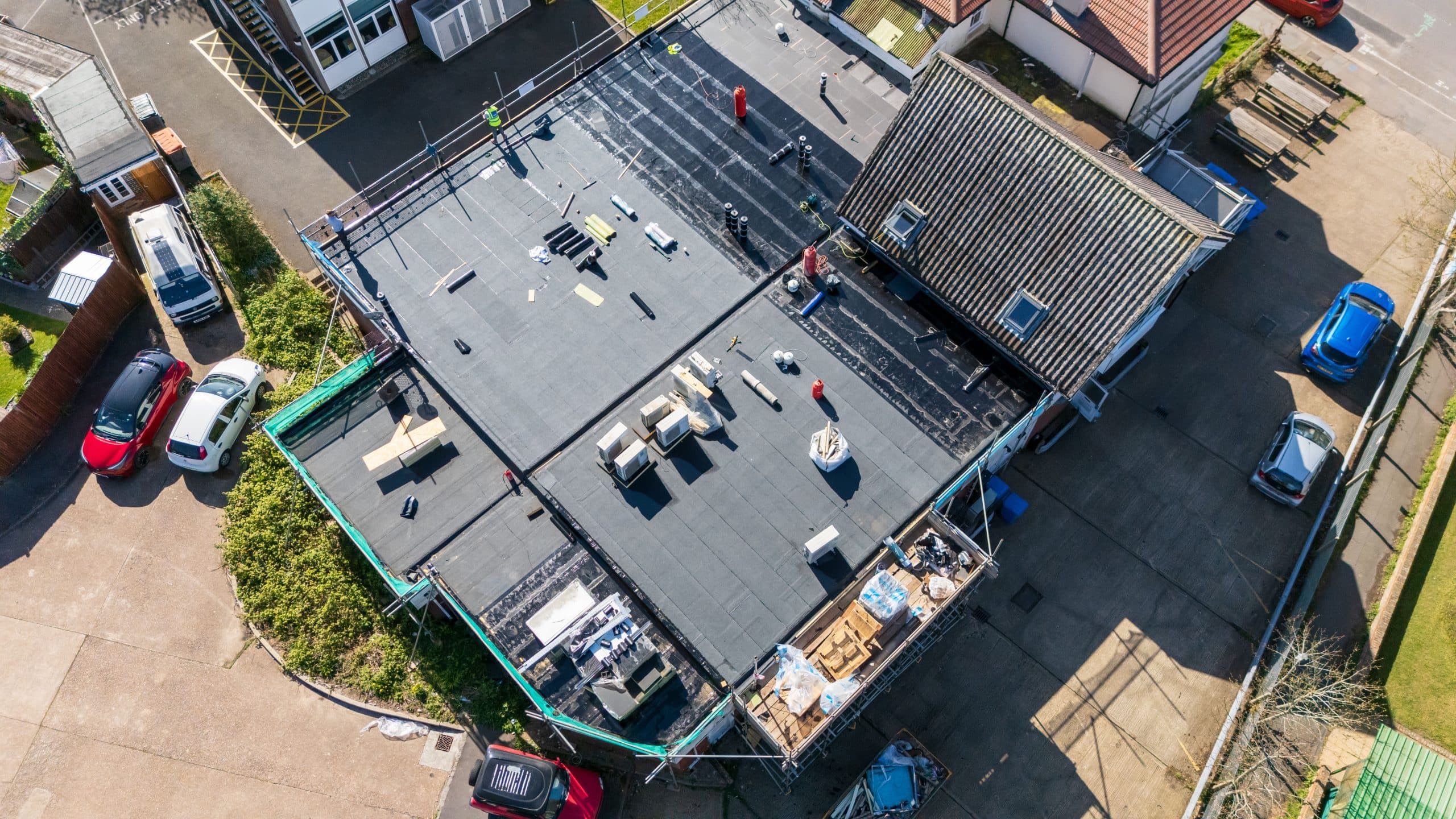 Flat roof renewal at Hailsham Memorial Institute, Western Road for Hailsham County Council, with full scaffolding, site setup, and a complete roofing system installation.