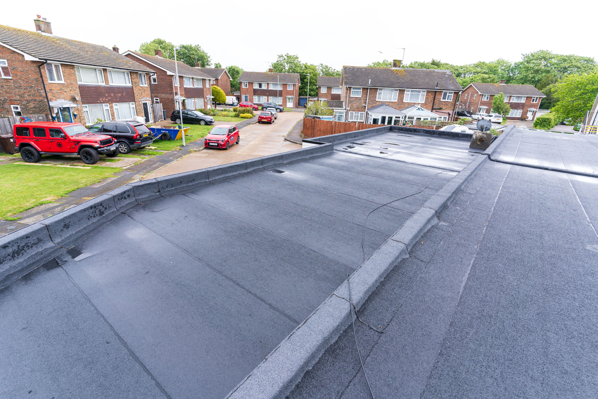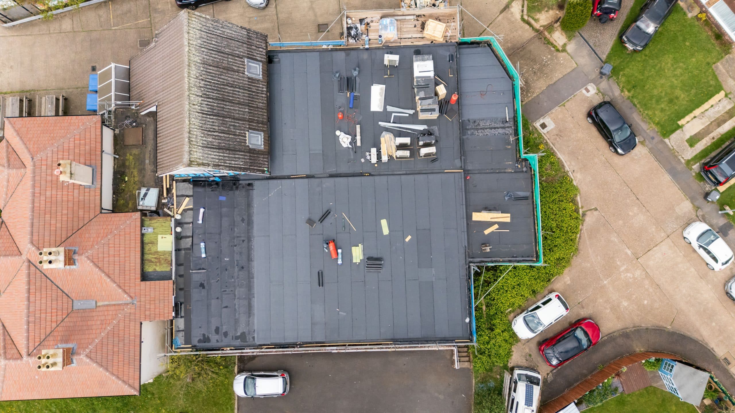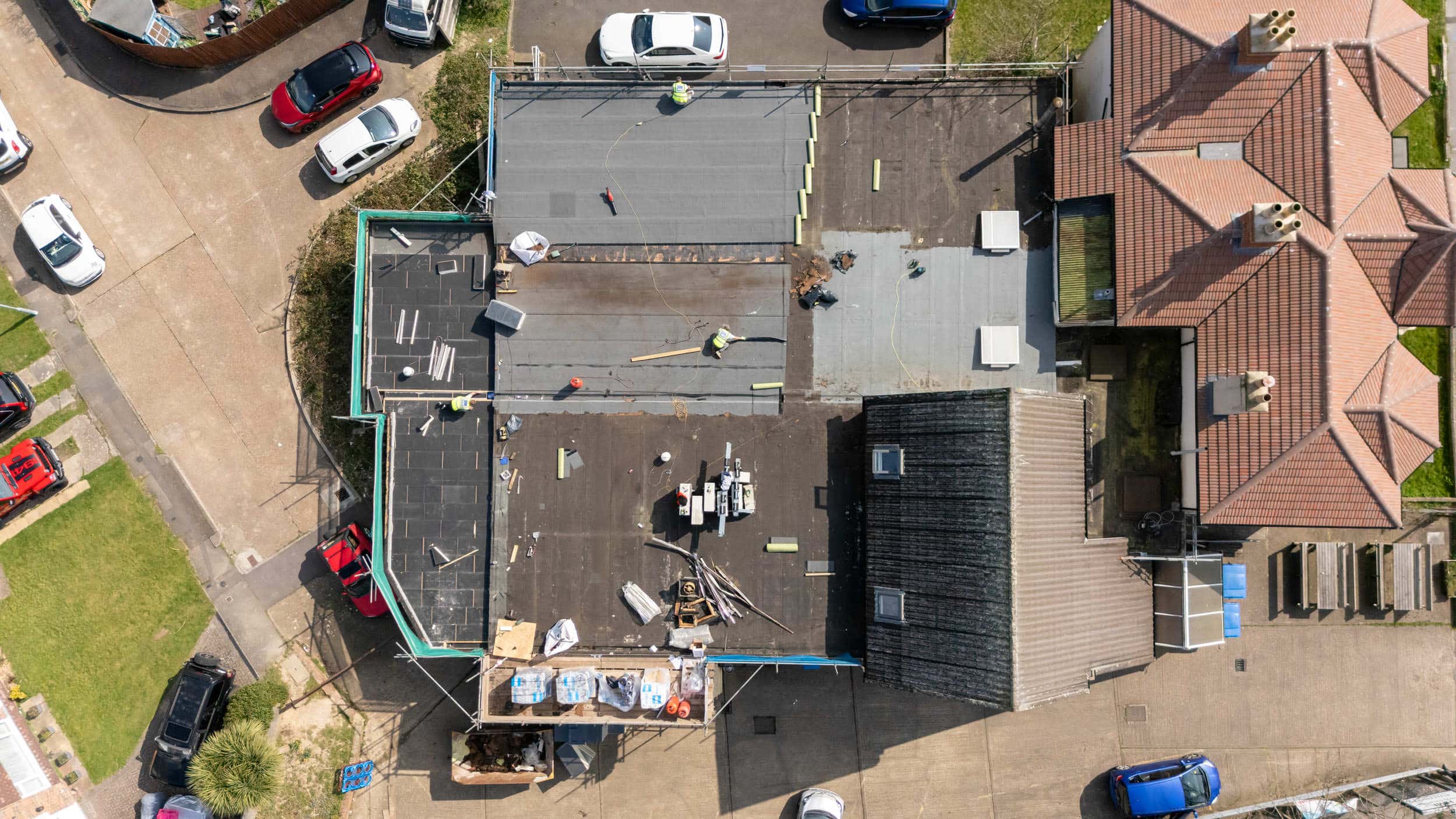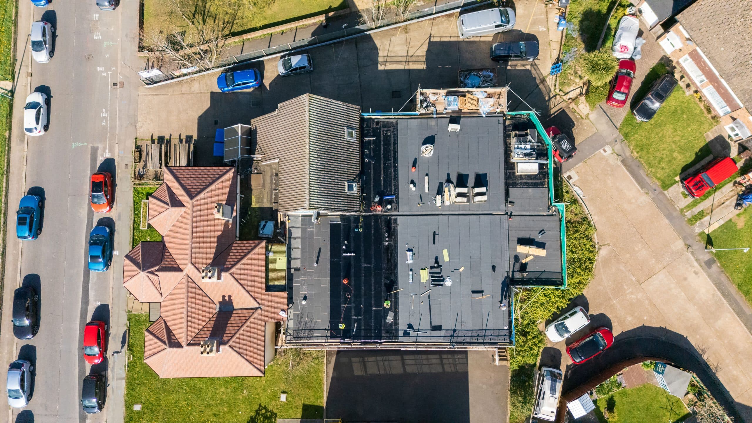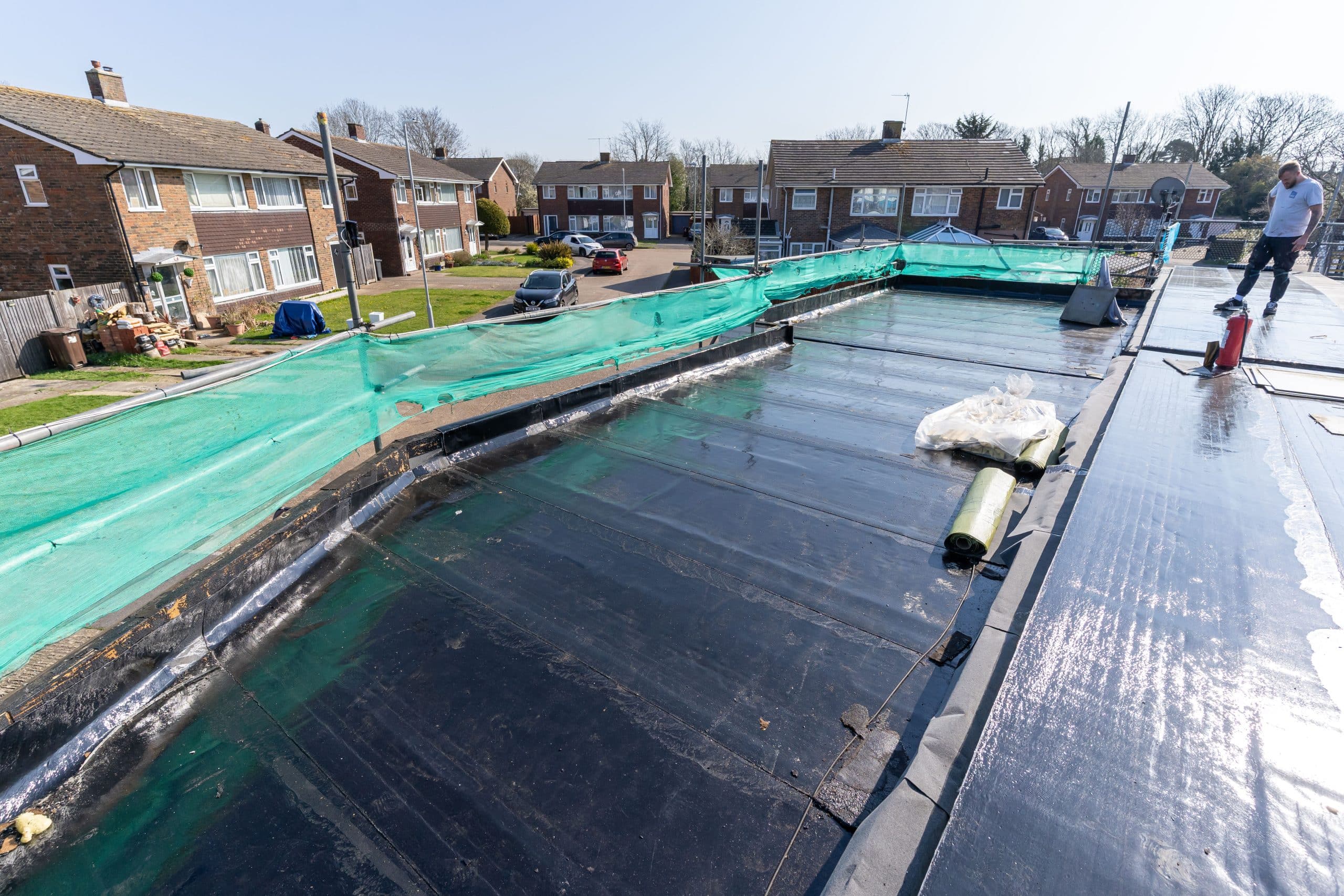 Flat roof renewal at Hailsham Memorial Institute, Western Road for Hailsham County Council, with full scaffolding, site setup, and a complete roofing system installation.
