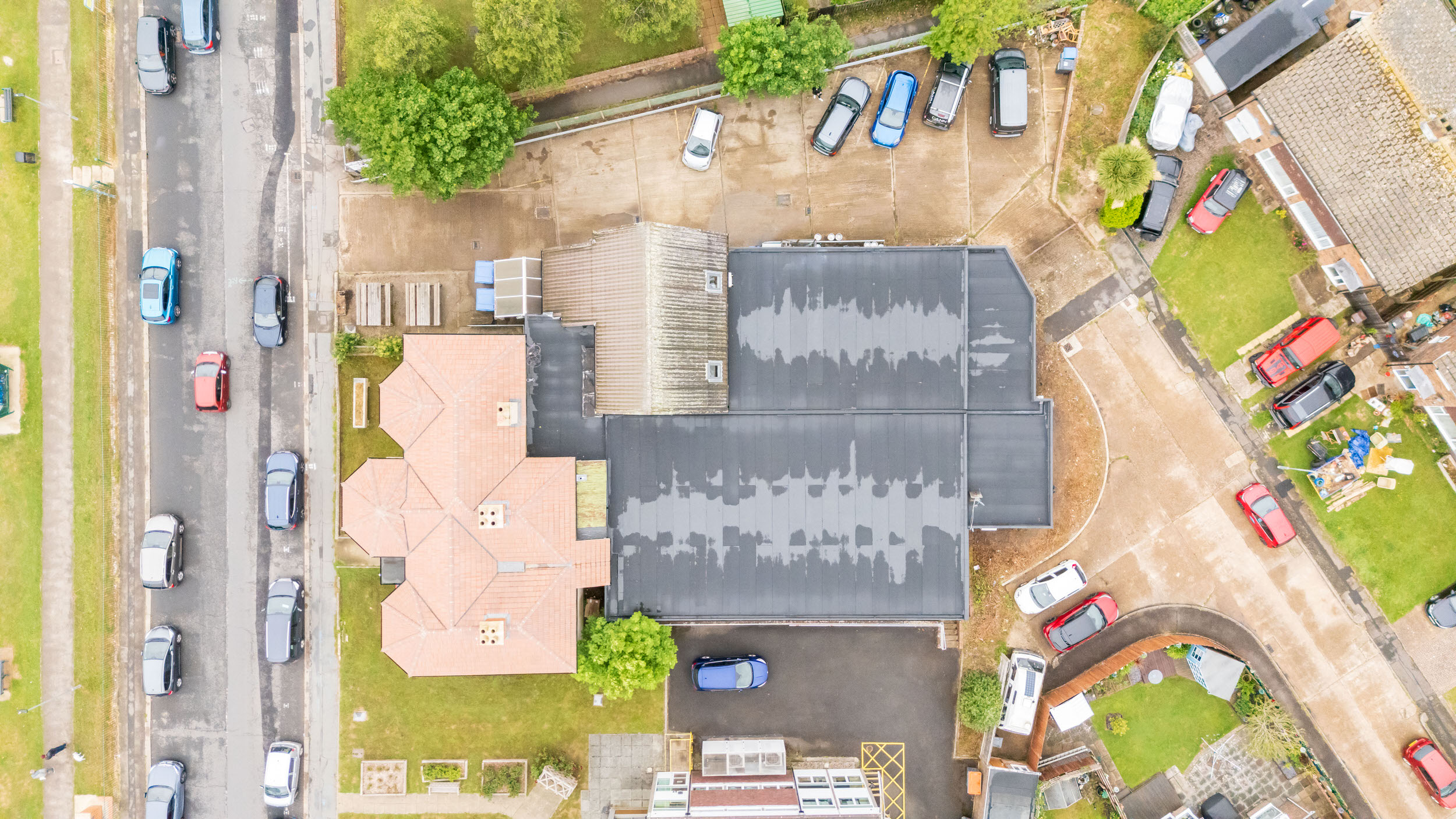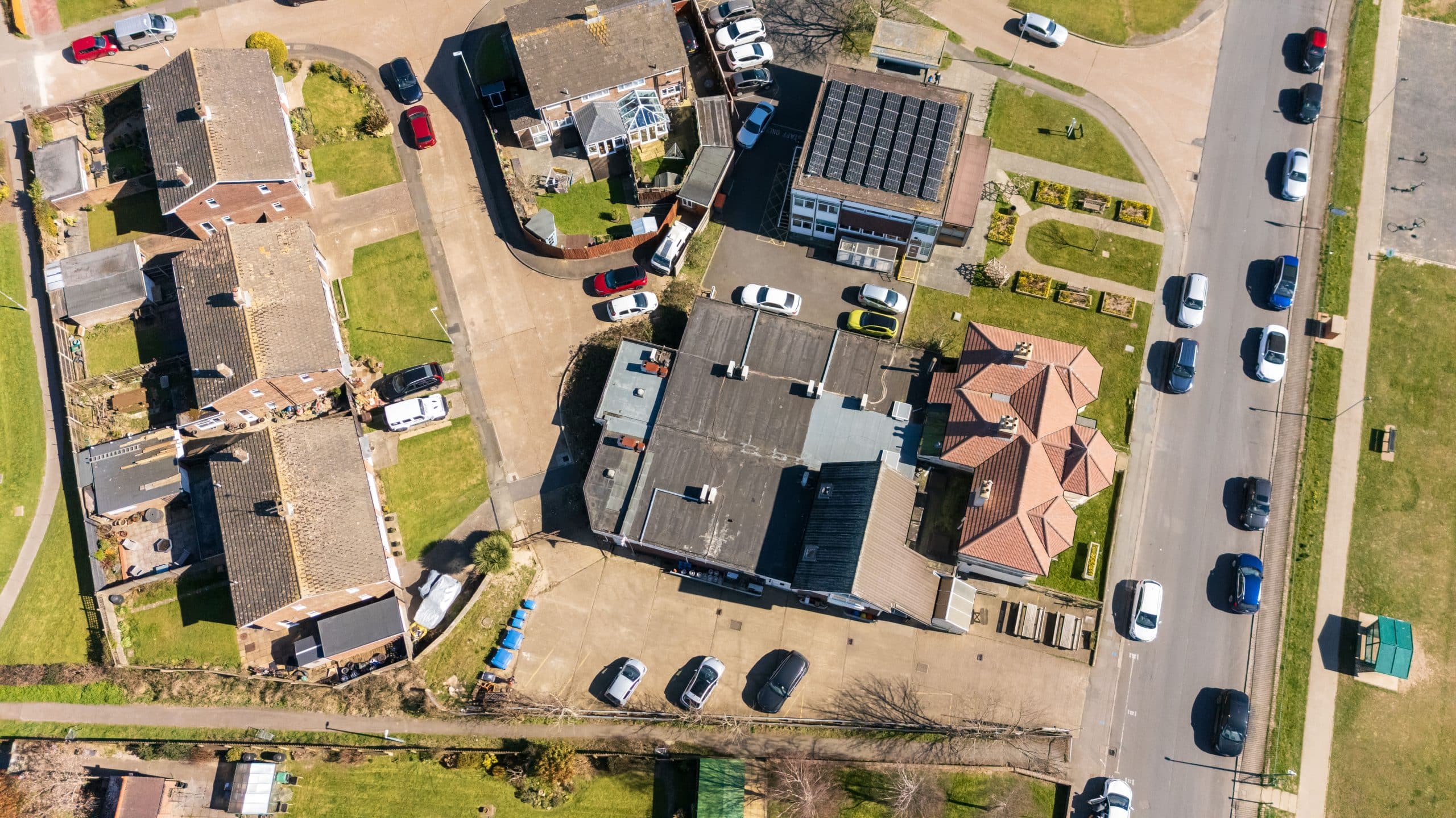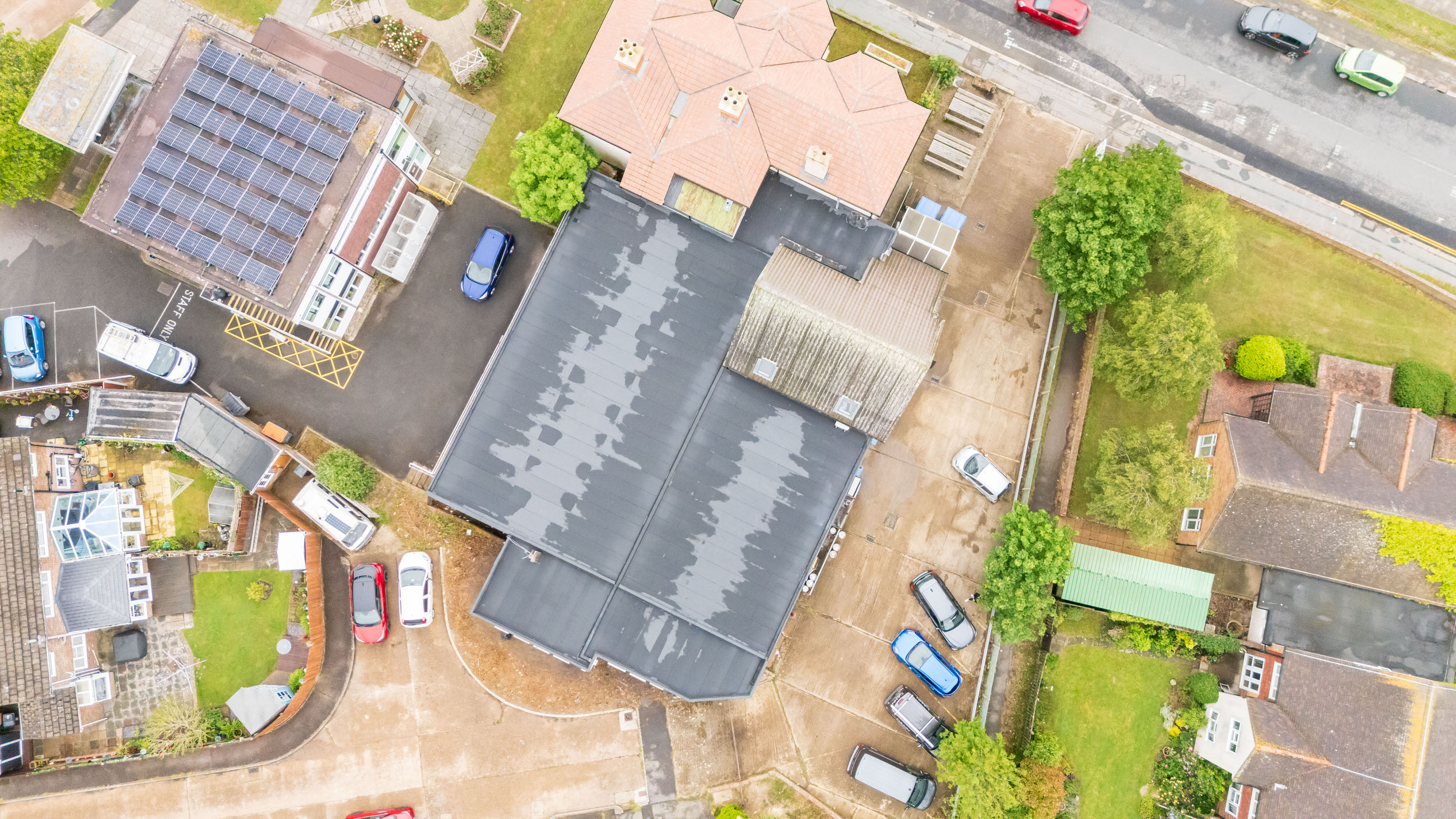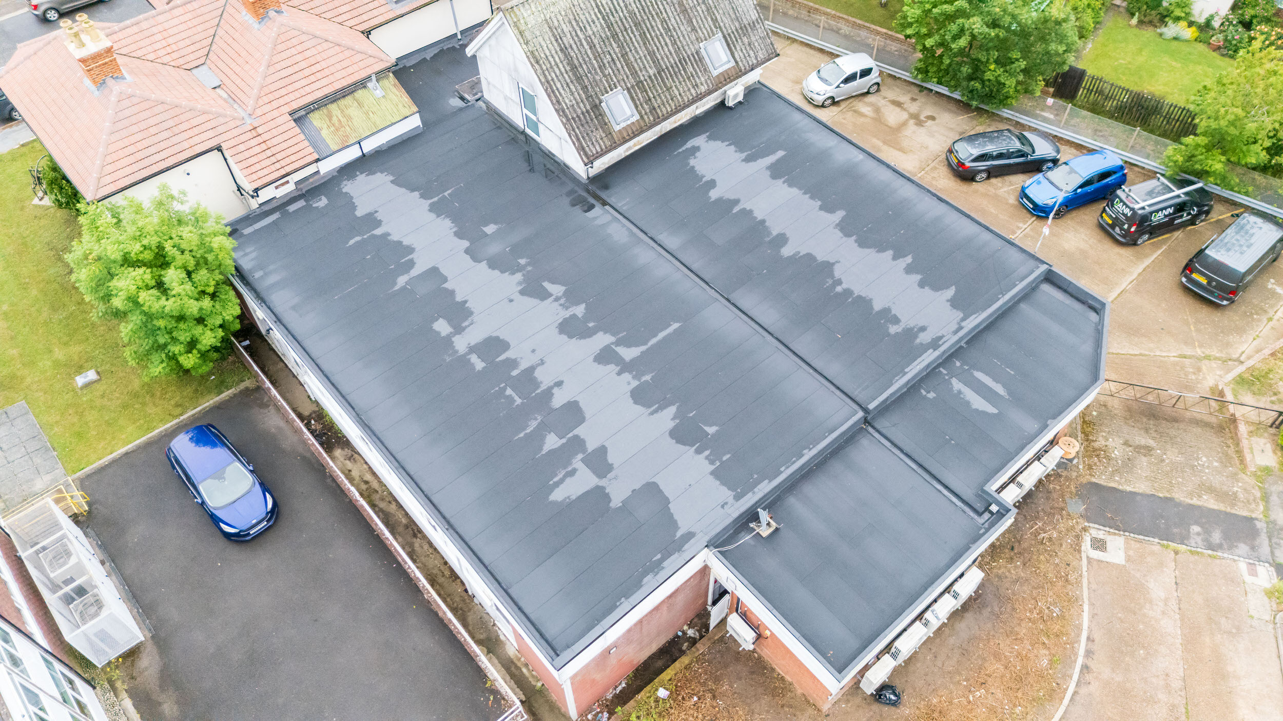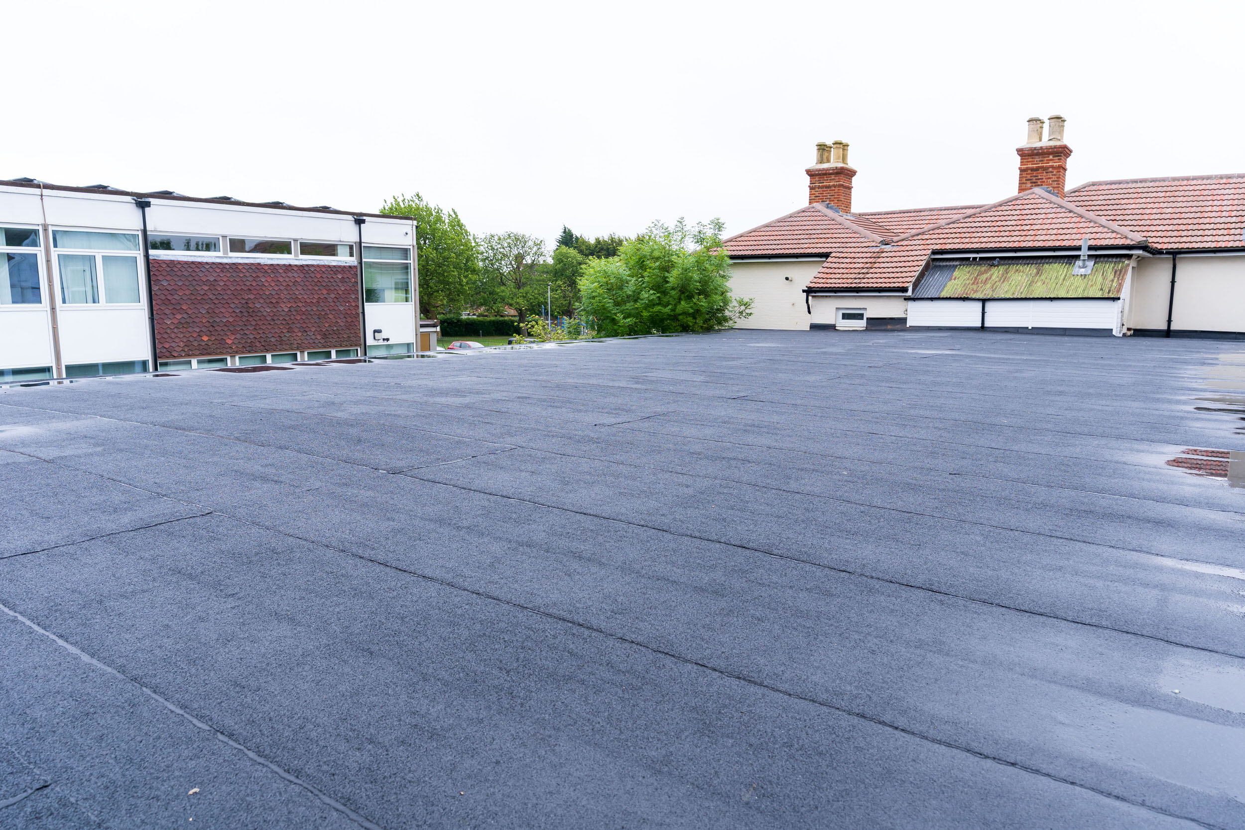 Flat roof renewal at Hailsham Memorial Institute, Western Road for Hailsham County Council, with full scaffolding, site setup, and a complete roofing system installation.