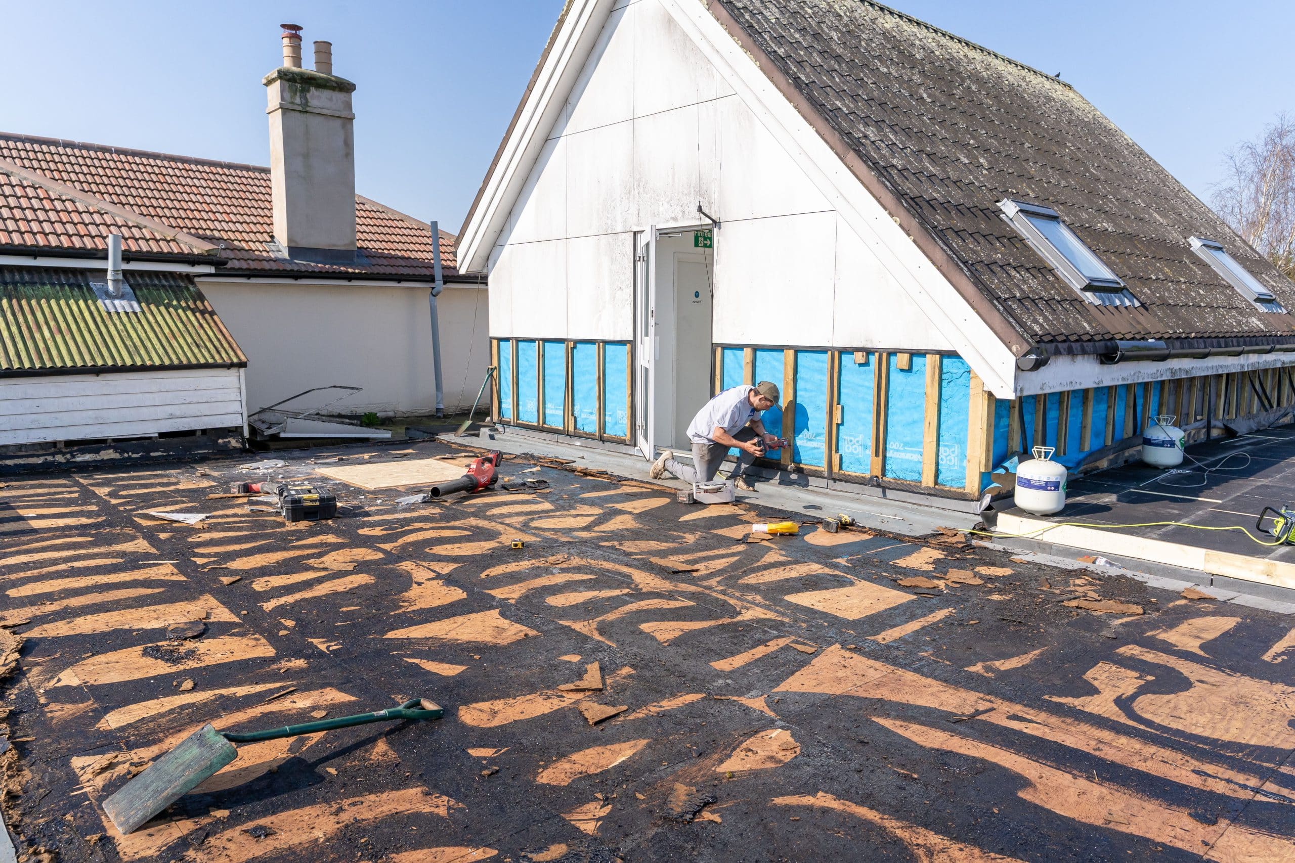Old Roof Removal: Stripping the existing roof and preparing the surface.