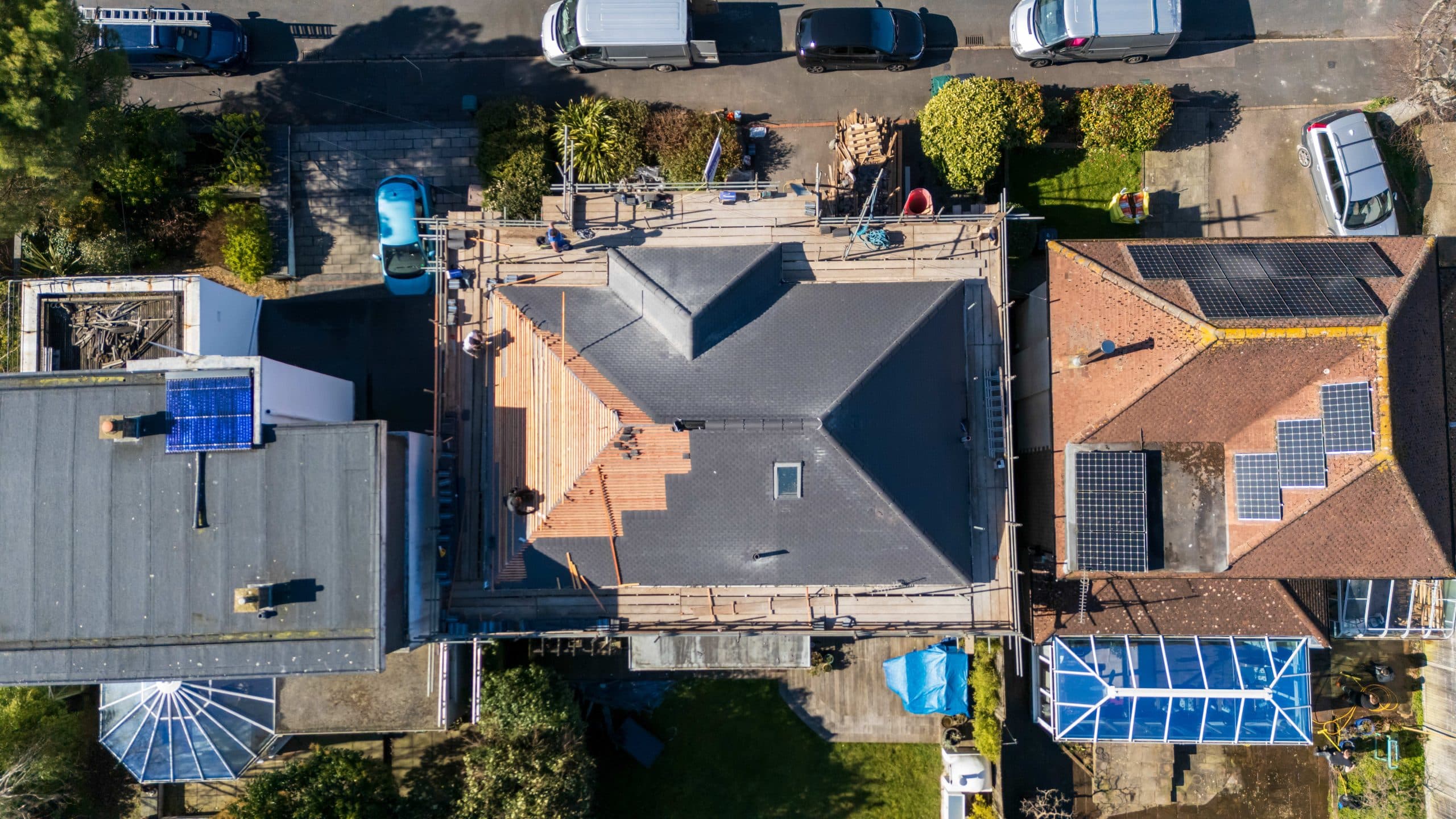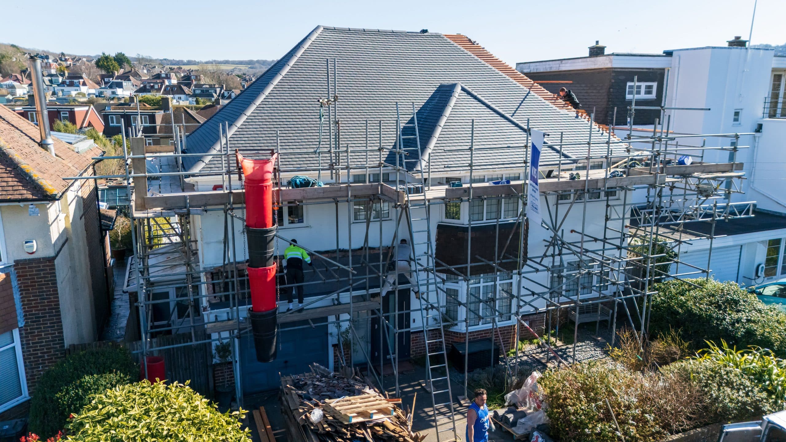Full roof refurbishment at High View North, including stripping existing materials and installing new Marley smooth grey tiles.